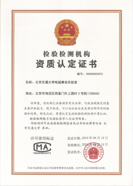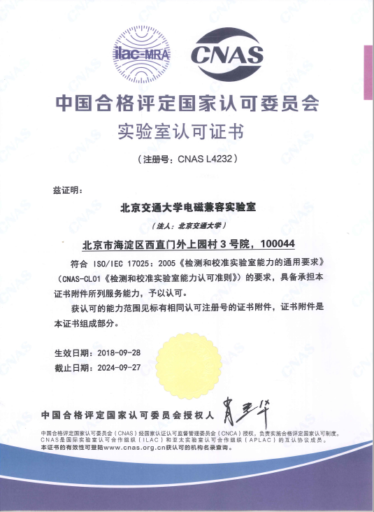 北京交通大学电磁兼容实验室是全国高校和铁路部门中成立最早的电磁兼容研究机构和专业检测机构,是原铁道部批准成立的“铁路电务设备电磁兼容检测中心”,是我国首批获得国家认可(CNAS)和国家计量认证(CMA)资质的实验室,也是中铁检验认证中心(CRCC)的签约实验室,承担了CRCC一类安全产品的符合性试验工作,完成了所有型号CTCS-3级列控系统及所有新型高速列车的接口型式试验。