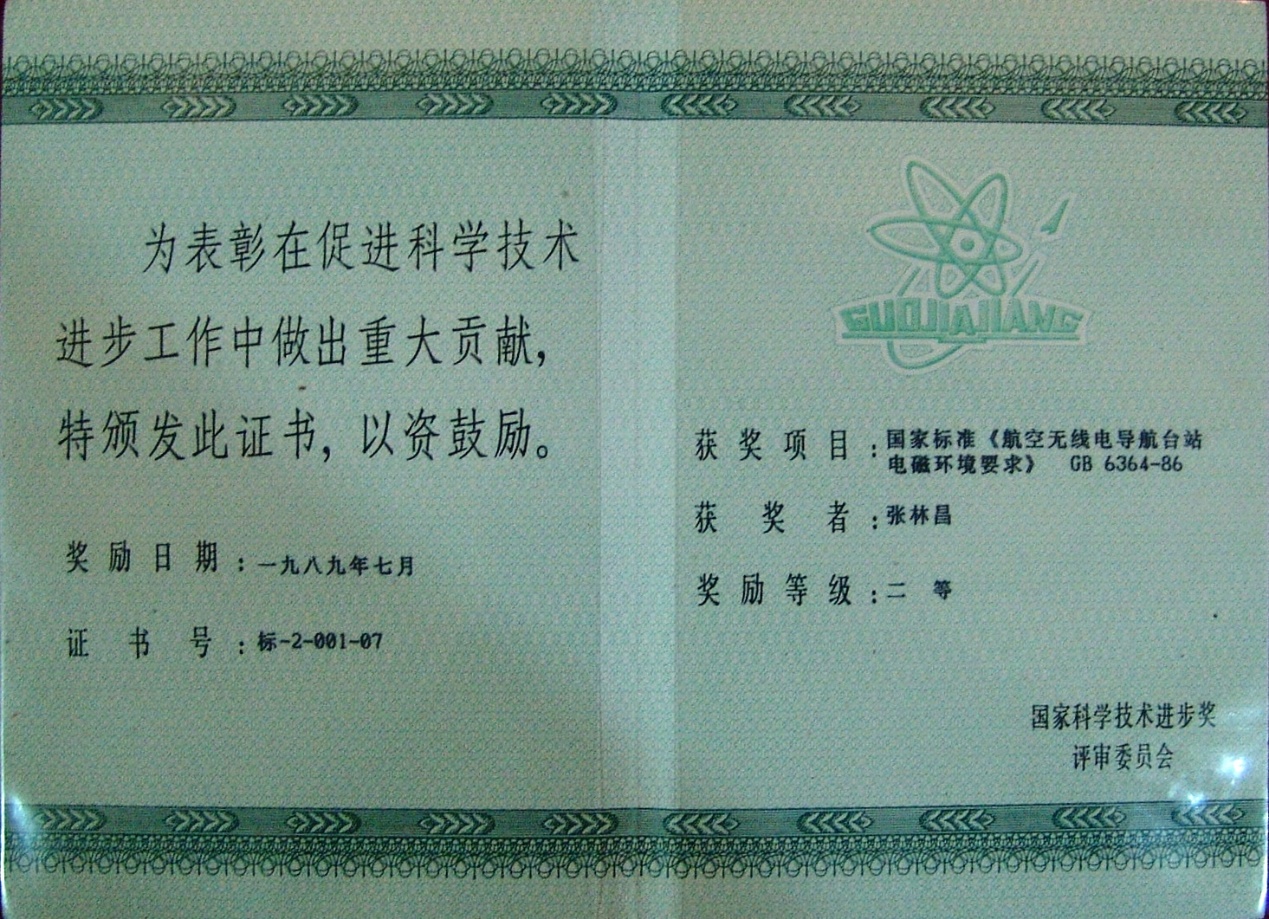 1. 国家科技进步二等奖:国家标准《航空无线电导航台站电磁环境要求》 GB 6364-86