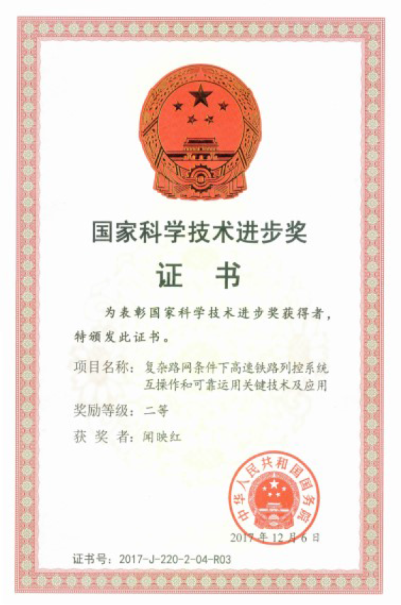 3. 国家科技进步二等奖:复杂路网条件下高速铁路列控系统互操作和可靠运用关键技术及应用