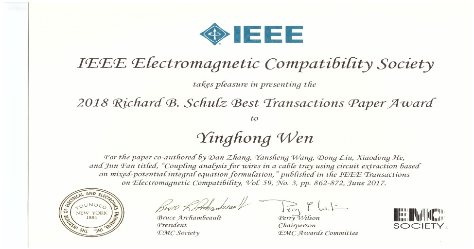 该成果2017年发表于IEEE Transaction on Electromagnetic compatibility,“Coupling Analysis for Wires in a Cable Tray Using Circuit Extraction Based on Mixed-Potential Integral Equation Formulation”,并获得2018年IEEE EMC 2018 Richard B. Schulz最佳期刊论文奖(全世界年度评选2篇)。