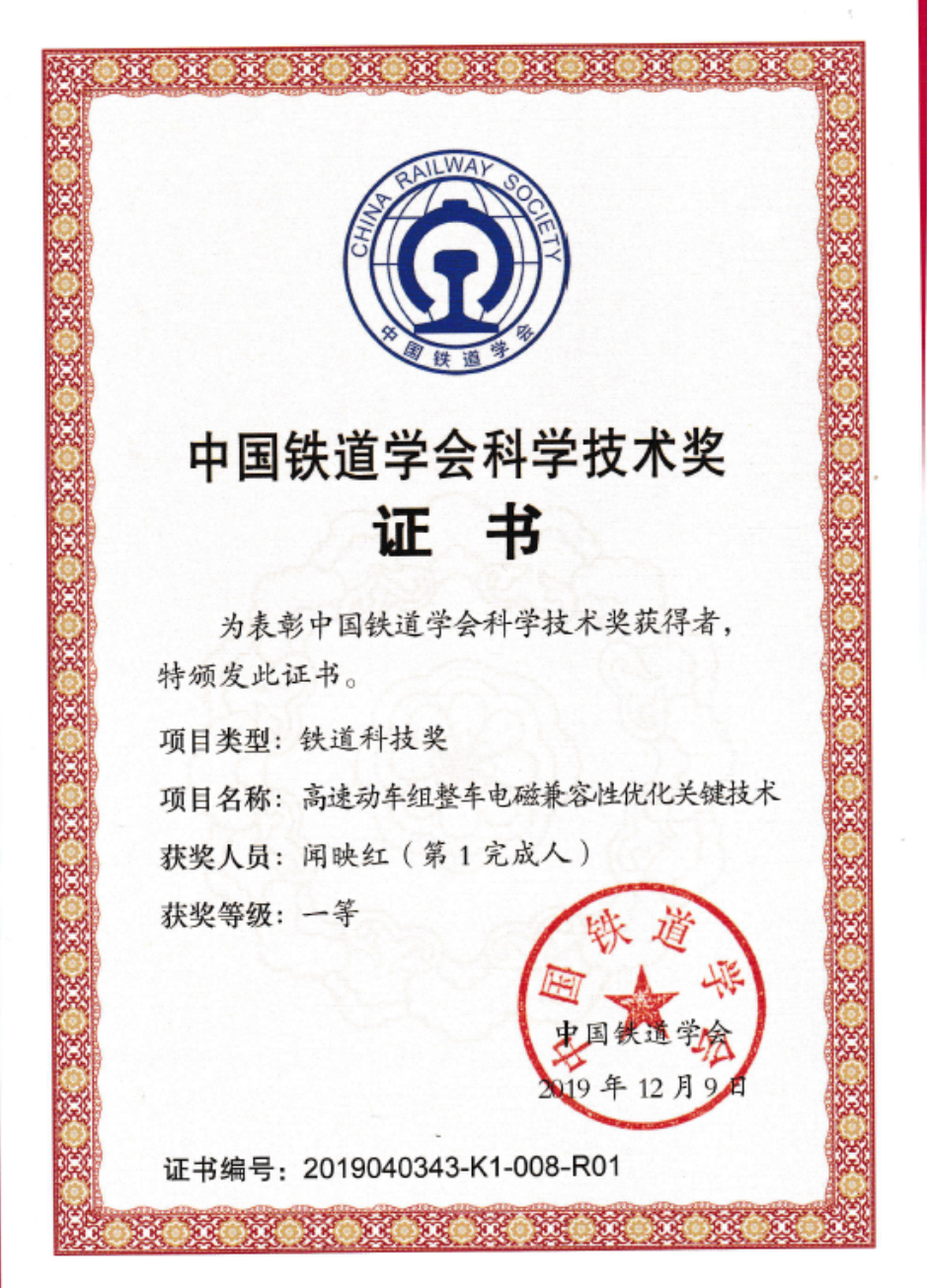 出版专著3部、获得授权发明专利11项、制定国家标准6项,形成了我国轨道交通电磁兼容国家标准体系的主框架,填补了我国高速动车组整车电磁兼容优化设计领域的空白。项目成果应用于中国标准动车组等多种型号列车,显著改善了列控车载设备工作电磁环境,从根本上彻底解决了本项目实施前因电磁兼容问题引发的列控车载设备故障,大幅降低了设备维护与故障处理成本。总体其技术水平已达本领域国际先进水平,促进了本行业关键技术进步,具备全面推广应用价值。2019年获得铁道科技一等奖。